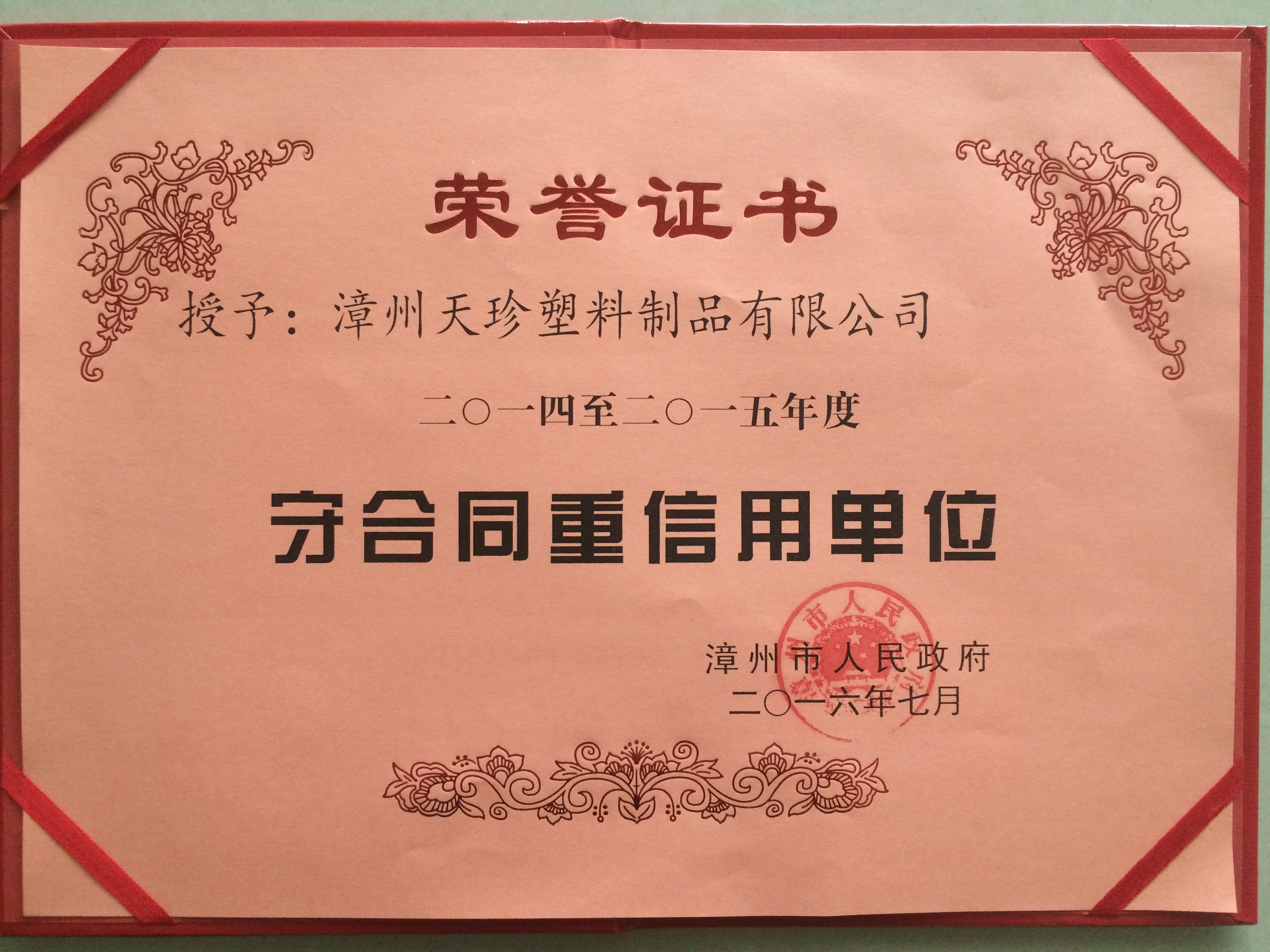 2016年7月榮獲“2014-2015年度守合同重信用單位” |